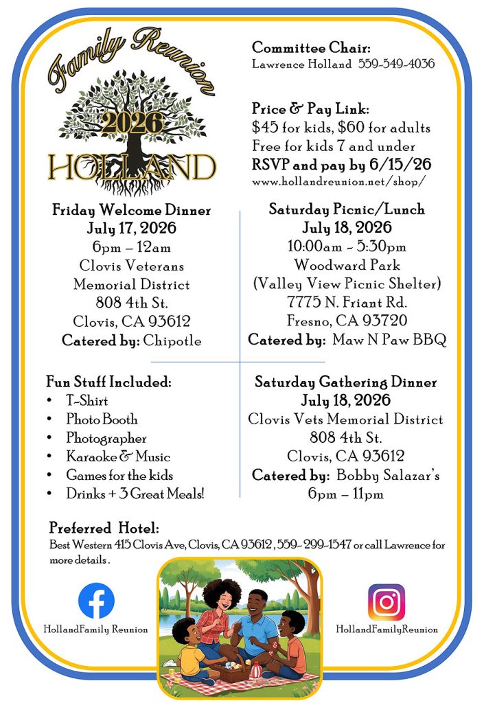 Newsflash! Announcing the 2026 Holland Family Reunion is scheduled on July 17th and 18th (Friday and Saturday)